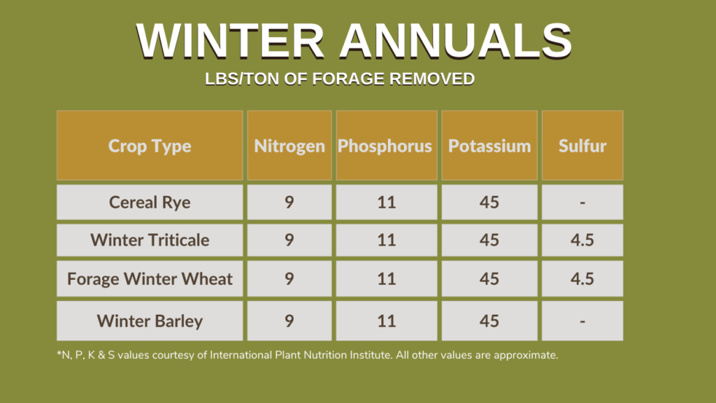 Haying or Chopping: if you are haying or chopping the winter annual, fertilize it. Nitrogen is the most useful nutrient for the winter annual when it breaks dormancy and starts greening up. The simplest thing to do is put down 30-50 lbs. of Nitrogen. However, if you have low fertility soils, consider putting down 10-20 lbs. of Potash and 10-15 lbs. of Phosphorous.