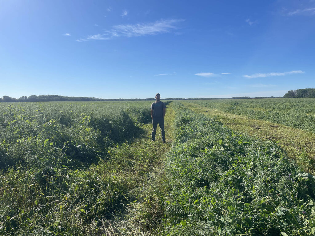 “The first time we tried swath grazing was with straight oats, and it did not work well for us. But since then, we’ve gone to more of a cover crop or polycrop. So, the main workhorses in it are still a spring cereal, but we’ve got forage peas in there, a couple different types of brassicas, and hairy vetch. And then we do throw a few more things in for diversity and nutrition, but also primarily for soil health. We add in a couple warm-seasons like sunflowers, buckwheat, and millet. And we’ll throw in another cool-season like Italian ryegrass, but those will be in a smaller portion compared to the brassicas, cereal, hairy vetch, and peas.”